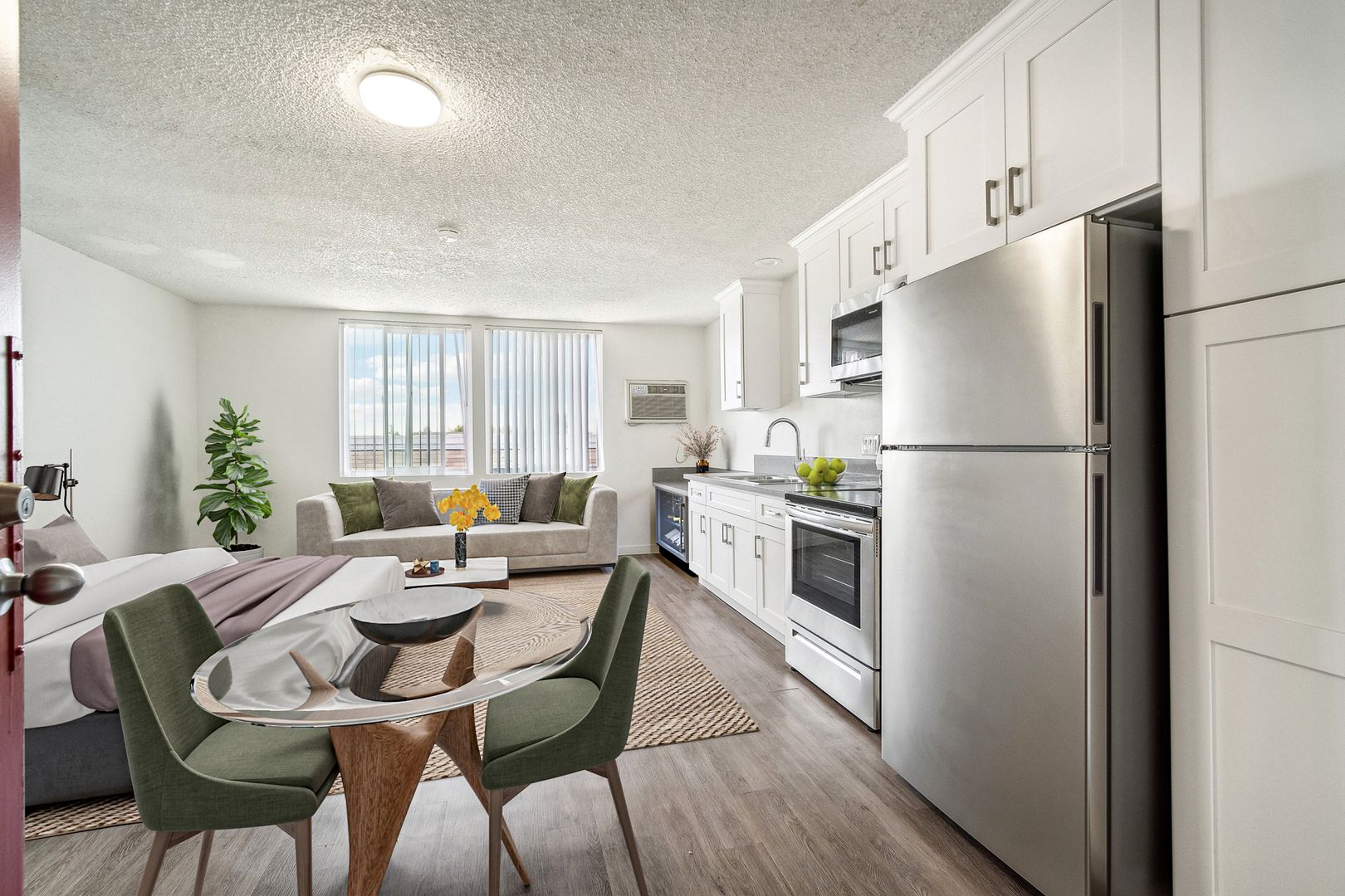 Our community is in the City of Los Angeles, located in the San Fernando Valley region. The Meridian Pointe neighborhood is home to California State University, Northridge (CSUN), the Northridge Fashion Center, and a diverse selection of popular Los Angeles shopping and dining. Our studio apartment homes have natural lighting with lovely views, stainless steel appliances, and modern wood-style floors throughout. This unit comes with a spacious closet, granite countertops in the kitchen and bathroom, a modern paint scheme, and a remote-control HVAC. Many of our units are newly renovated this year. Utilities are included in the rent! Our property has state-of-the-art amenities that make living at Meridian Pointe convenient. All our residents have access to our large sparkling swimming pool and spa, lounge area, conference rooms, and study areas. We have a fully-equipped fitness center with free weights, on-site laundry rooms, vending machines, and BBQ/picnic areas to hang out with friends and family and enjoy the outdoors! We also offer furniture rentals at your convenience. Please contact one of our leasing professionals to schedule a tour of our community and reserve your next apartment home today. **We reserve the right to change pricing at any time for any reason. Pictures shown might not depict actual units available**
